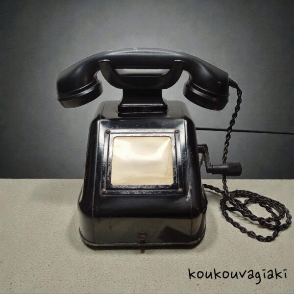 Vintage επιτραπέζια τηλεφωνική συσκευή, χειροκίνητη με μανιβέλα, από βακελίτη, δεκαετίας του 1930. Ο χρήστης έπρεπε να γυρίσει τη μανιβέλα για να στείλει σήμα στο τηλεφωνικό…