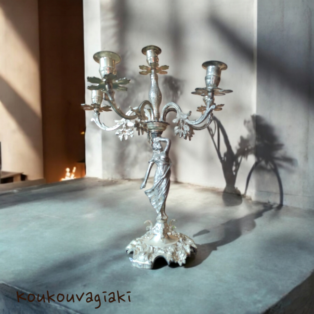 Μεταλλικό κηροπήγιο για έξι κεριά. Στη βάση του απεικονίζεται μια γυναικεία φιγούρα με αρκετά ρεαλιστική κινησιολογία.