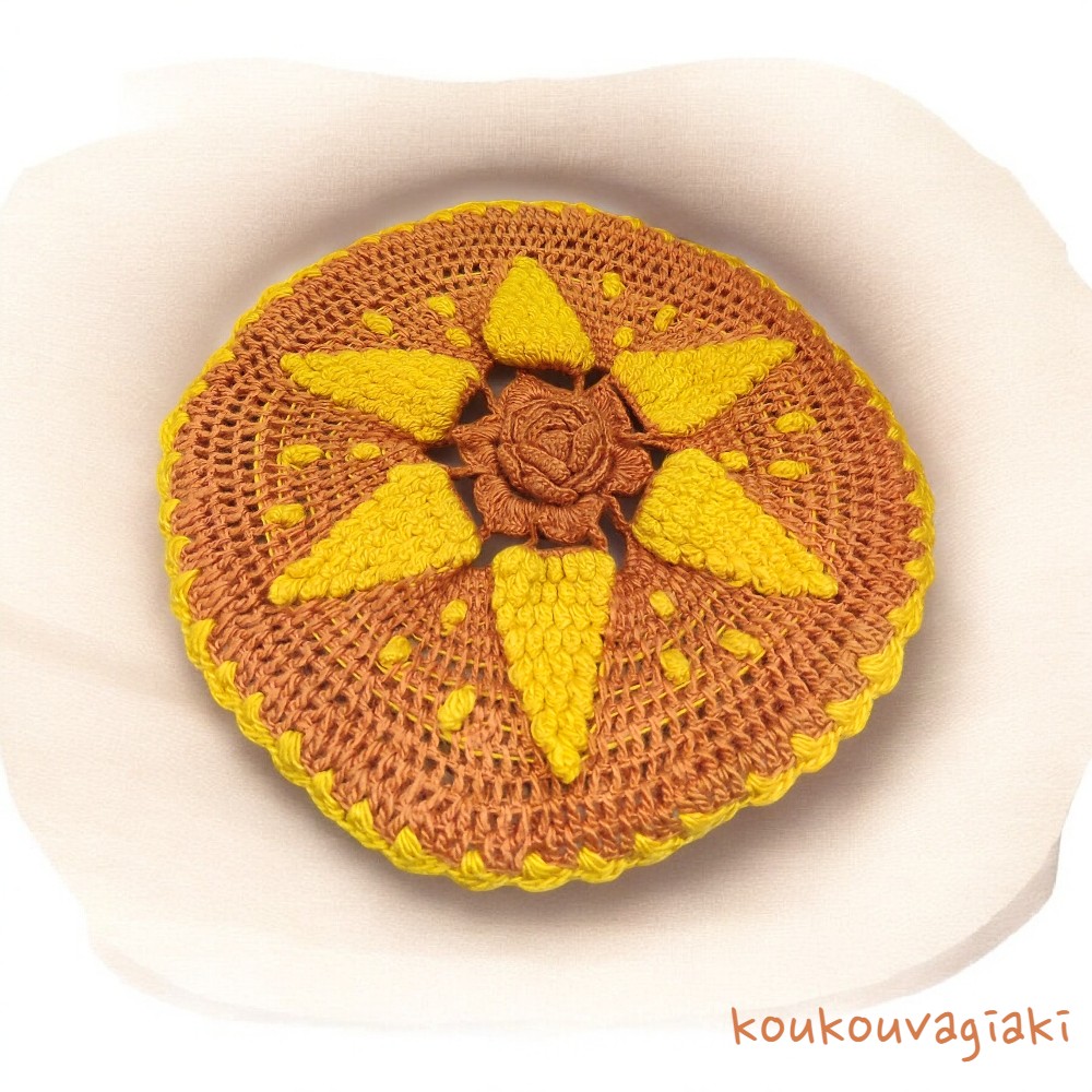 Χειροποίητη πλεκτή μαξιλαροθήκη σε σχήμα ήλιου.